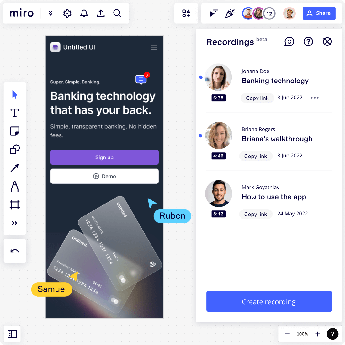 Watch a Talktrack in action. Talktracks are tied to the board so viewers can reposition the video on the canvas, add comments & sticky notes, and view past recordings, all in one place.