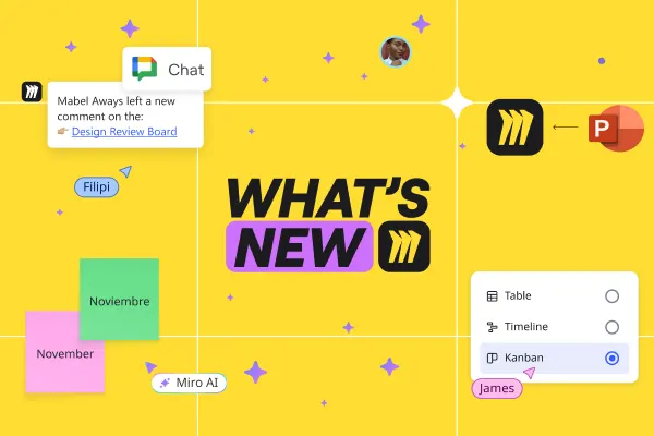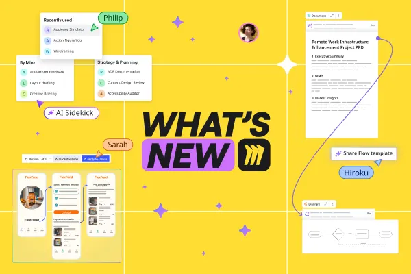 The AI Innovation Workspace is here! It’s where your team and AI work together, right on the canvas — with Sidekicks and Flows to keep teamwork flowing. Plus, check out Miro for Product Acceleration: designed to help teams build the right thing, and get from idea to launch faster.